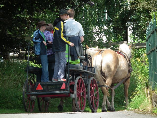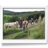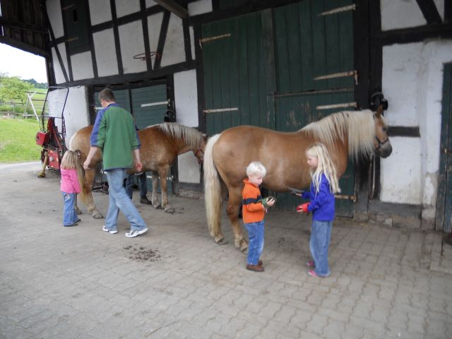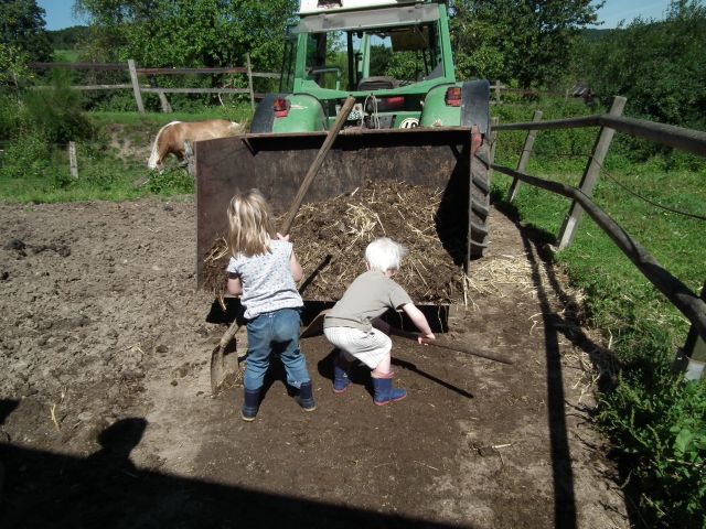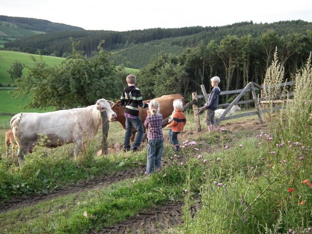 Kühe, Katzen und unsere Pferde "Betty und Muna" können nach Herzenslust gestreichelt und verwöhnt werden. Und natürlich dürft Ihr bei der Landarbeit auf unserem Hof mithelfen. Mit etwas Glück wird während des Urlaubs auch ein Kälbchen geboren oder der Hufschmied kommt vorbei -